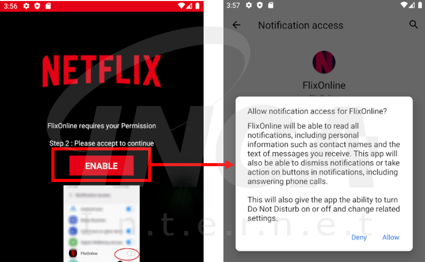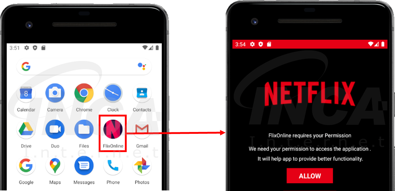 해당 악성 앱은 FilxOnline 이라는 이름으로 Google Play 에서 판매되고 있었으며, 하기의 이미지와 같이 넷플릭스를 사칭하여 정상 앱과 유사한 모습과 이름으로 사용자를 속이고 있다.