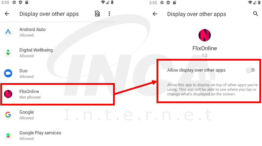 해당 앱을 실행하면 다음과 같이 과도한 권한을 요구한다. 먼저, 메인 화면의 ‘Allow’ 버튼을 클릭하면 아래의 그림과 같이 오버레이가 가능하도록 설정을 바꾸기를 유도한다. 이는 다른 앱이 실행될 때 그 위에 해당 앱을 실행하도록 할 수 있는 권한으로 정보 탈취 등의 동작으로 이어질 수 있다.