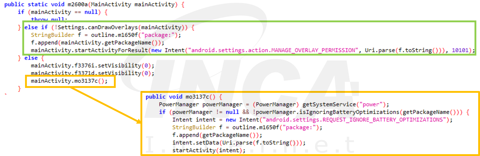아래의 초록색 상자를 보면 오버레이 권한을 획득하는 것을 볼 수 있다. 그리고 해당 앱이 꺼지지 않고 계속해서 실행되도록 배터리 최적화 요청을 무시하도록 설정한다.