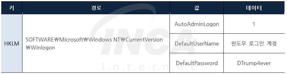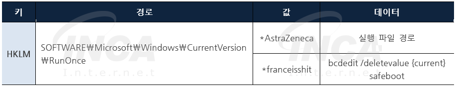 그 후, 안전모드에서 랜섬웨어를 자동 실행하기 위해 [표 2]와 같이 변경된 값에 “*”를 추가하고, 부팅 후 안전 모드 설정 값을 삭제하여 정상 모드로 부팅하도록 설정한다.