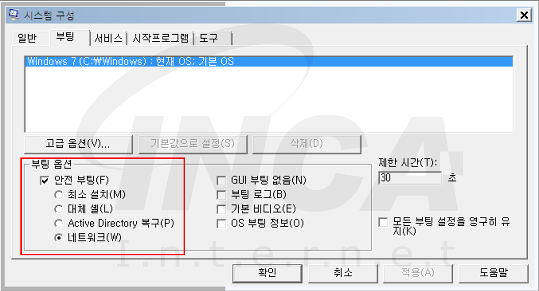 [표 1]의 명령어가 실행되면 부팅 옵션이 [그림 2]와 같이 ‘안전 부팅-네트워크’로 설정된다.