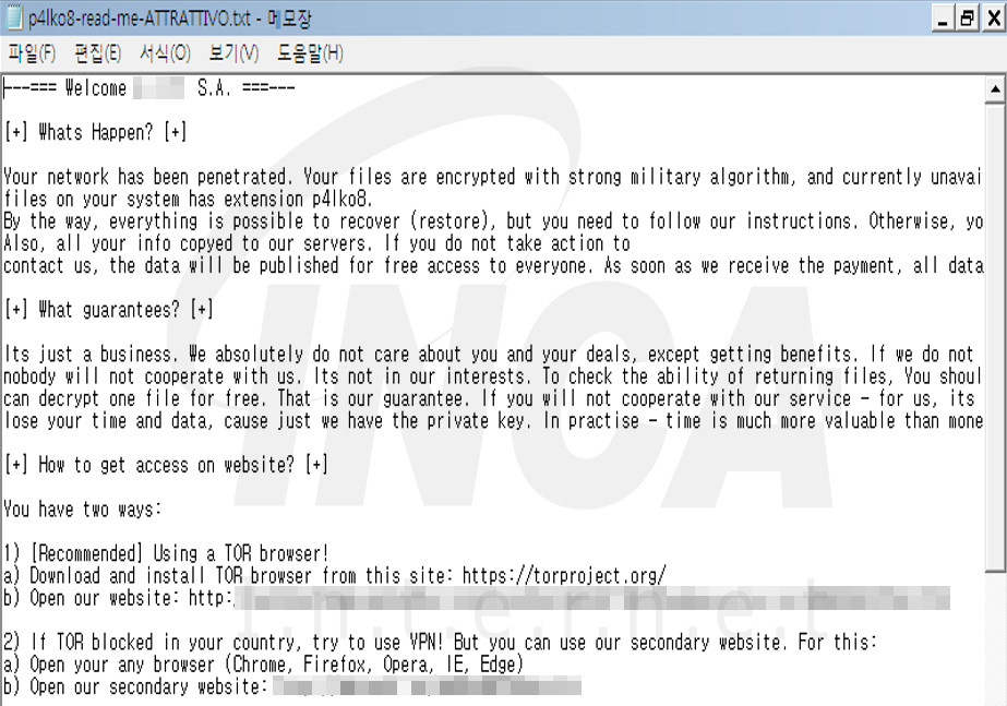 또한, 해당 랜섬웨어에 감염되면 폴더마다 “p41ko8-read-me-ATTRATTIVO.txt”란 이름의 랜섬노트를 생성하여 사용자에게 감염사실을 알린다.