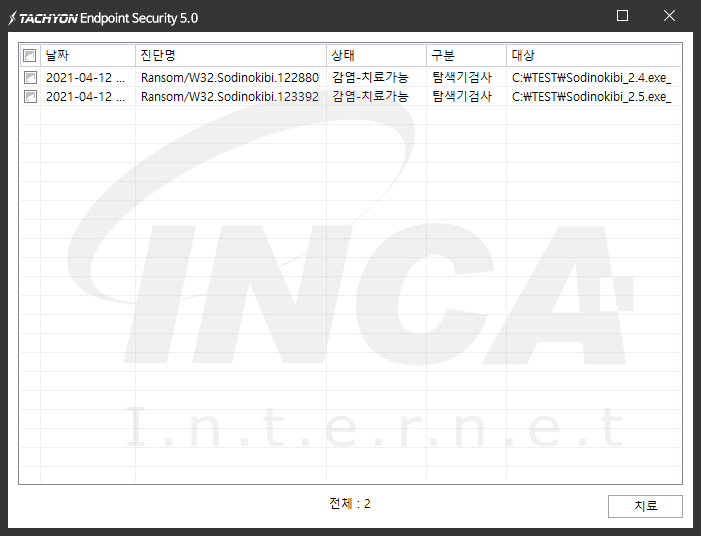 상기 악성코드는 잉카인터넷 안티바이러스 제품 TACHYON Internet Security 5.0에서 진단 및 치료가 가능하다.