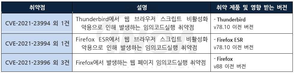 Mozilla 사는 제품에서 발생하는 취약점에 대한 보안 업데이트를 발표하고, 관련 취약점을 해결하기 위해 최신 버전으로 업데이트할 것을 권고하였다.