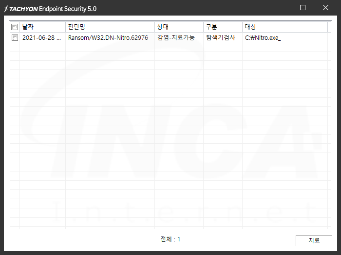 상기 악성코드는 잉카인터넷 안티바이러스 제품 TACHYON Internet Security 5.0에서 진단 및 치료가 가능하다.