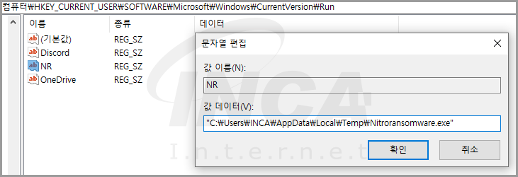 “Nitro” 랜섬웨어는 암호화 이전에 PC를 재부팅 할 때 자동으로 악성 동작을 실행할 수 있도록 레지스트리에 등록한다.