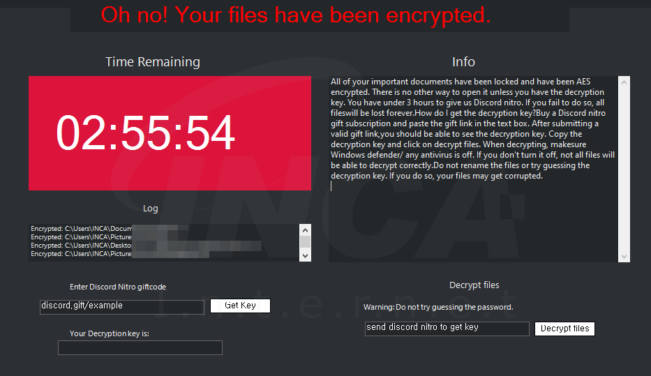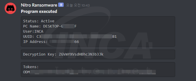 “Nitro” 랜섬웨어는 감염된 사용자의 Discord 토큰과 PC 정보를 탈취하고, 특정 경로의 파일을 암호화한다. 하지만 암호화된 파일의 복호화 키를 텍스트 파일에 저장하기 때문에 랜섬머니를 지불하지 않고도 파일의 복구가 가능하다.