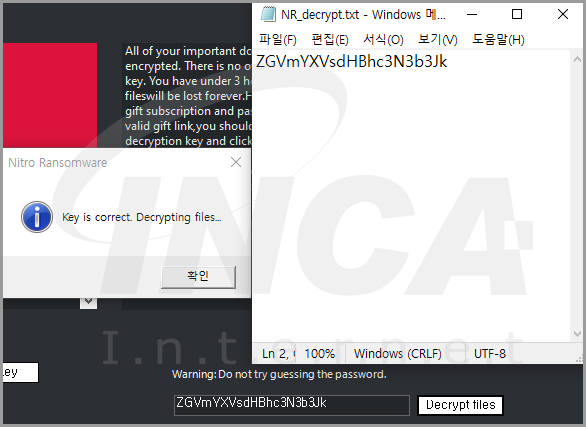 해당 랜섬웨어는 “%TEMP%” 경로에 복호화 키 값을 저장한 “NR_decrypt.txt” 파일을 드랍한다. 따라서 “Nitro” 랜섬웨어는 랜섬머니를 지불하지 않아도 해당 텍스트 파일에 저장된 복호화 키를 이용해 복호화가 가능하다.