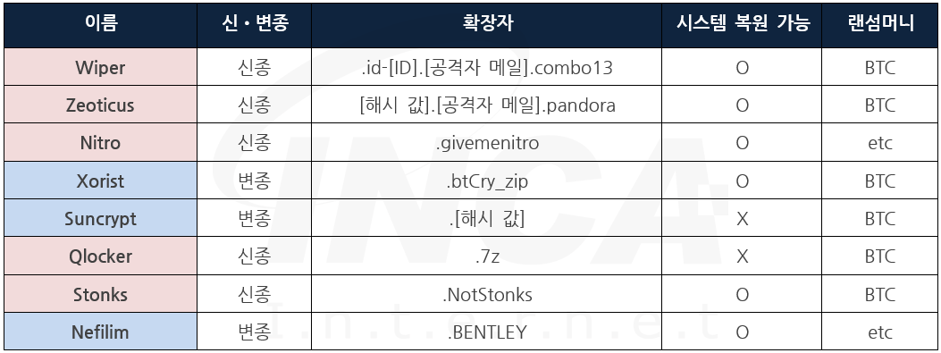 잉카인터넷 대응팀은 2021년 4월 16일부터 2021년 4월 22일까지 랜섬웨어 신•변종 및 이슈와 관련하여 대응을 진행하였으며, 신종 랜섬웨어는 “Wiper” 외 4건, 변종 랜섬웨어는 “Xorist” 외 2건이 발견됐다.