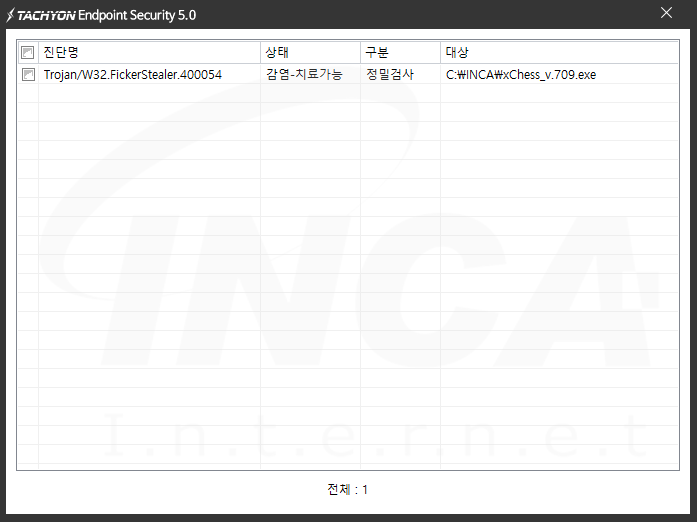 상기 악성코드는 잉카인터넷 안티바이러스 제품 TACHYON Internet Security 5.0에서 진단 및 치료가 가능하다.