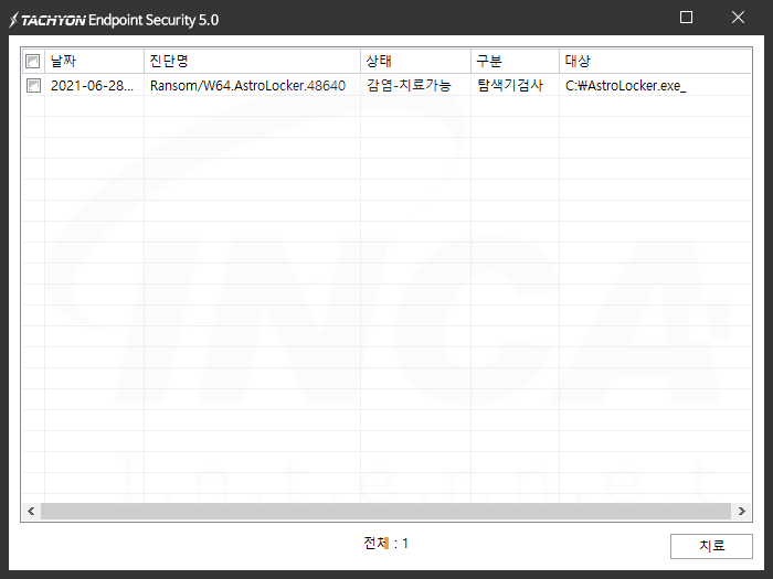 상기 악성코드는 잉카인터넷 안티바이러스 제품 TACHYON Internet Security 5.0에서 진단 및 치료가 가능하다.