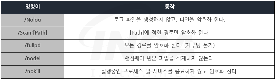 그리고 암호화된 파일 정보 및 감염된 PC 정보가 담긴 로그 파일을 생성하여 공격자의 C&C 서버로 전송하고, [표 1]의 명령어를 통해 암호화 동작을 지정할 수 있는 기능이 추가되었다.