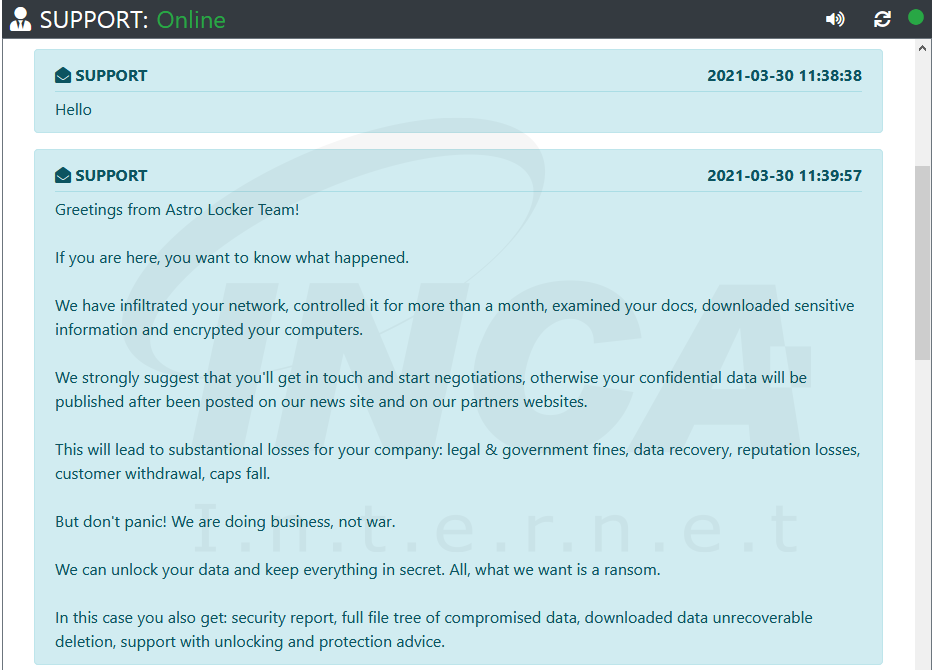 해당 내용의 증거로 기존에 사용하던 MountLocker 데이터 유출 사이트는 Astro Team이라는 데이터 유출 사이트로 이관하여 동일한 탈취 데이터가 게시됐고, 랜섬머니 협상을 위한 채팅 사이트에서는 본인들을 AstroLocker Team이라고 칭하기 시작했다. 또한, 파일과 암호화 키를 암호화하는 루틴 및 랜섬노트가 MountLocker와 AstroLocker가 동일한 것을 확인할 수 있었다.