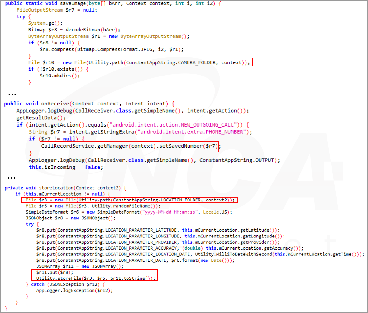 또한 아래와 같이 카메라 정보, 사용자 전화번호 정보, 위치 정보등을 탈취하여 각각의 해당 폴더에 보관한다. 이외에도 여러가지 정보를 탈취한다. 해당 폴더에 대한 내용은 [표 2] 에서 언급하도록 한다.