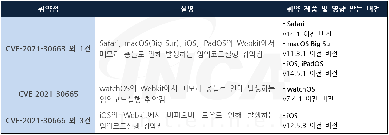 Apple 사는 제품에서 발생하는 취약점에 대한 보안 업데이트를 발표하고, 관련 취약점을 해결하기 위해 최신 버전으로 업데이트할 것을 권고하였다.
