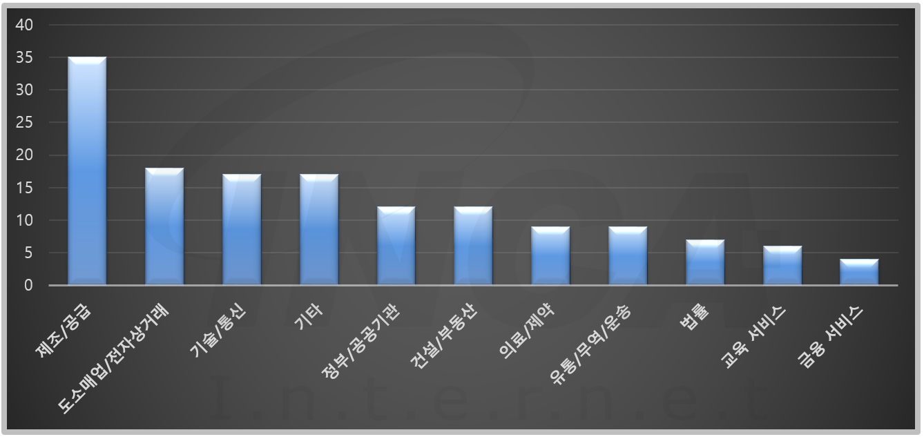 2021년 4월(4월 1일 ~ 4월 30일)에 발생한 데이터 유출 건을 산업별로 비교하였을 때 제조/공급 분야가 가장 많은 공격을 받았고, 도소매업/전자상거래 분야 및 기술/통신 분야가 그 뒤를 따랐다.