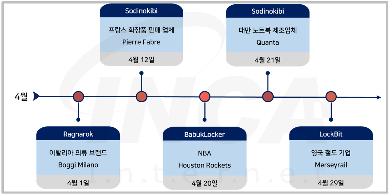 2021년 4월(4월 1일 ~ 4월 30일) 한 달간 랜섬웨어 동향을 조사한 결과, “Sodinokibi” 랜섬웨어가 프랑스 화장품 판매 업체 Pierre Fabre와 대만의 노트북 제조업체 Quanta를 공격했다. 또한, “Ragnarok" 랜섬웨어가 이탈리아 의류 브랜드인 Boggi Milano를 공격했고, NBA Houston Rockets와 영국 철도 기업 Merseyrail이 각각 “BabukLocker” 랜섬웨어와 “LockBit” 랜섬웨어 공격을 받아 데이터가 유출된 사건이 있었다.