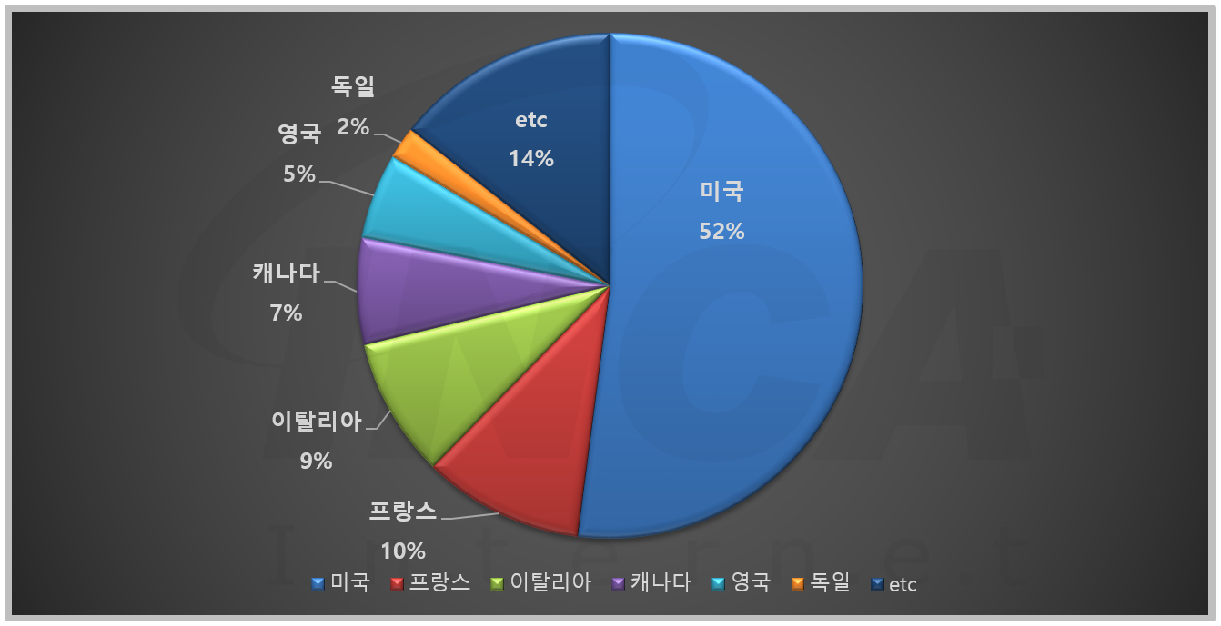 2021년 4월(4월 1일 ~ 4월 30일)에 발생한 데이터 유출 건을 국가별로 비교하였을 때 미국이 52%로 가장 높은 비중을 차지했고, 프랑스와 이탈리아가 각각 10%와 9%, 캐나다와 영국 각각 7%와 5%로 그 뒤를 따랐다.