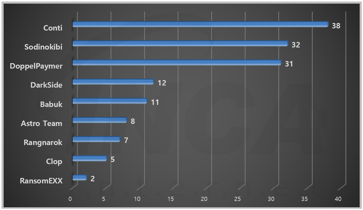 2021년 4월(4월 1일 ~ 4월 30일)에 발생한 데이터 유출 현황을 랜섬웨어 진단명 별로 비교하였을 때 “Conti” 랜섬웨어가 38건으로 가장 많은 데이터 유출이 있었고, “Sodinokibi” 랜섬웨어가 32건으로 두번째로 많이 발생했다.
