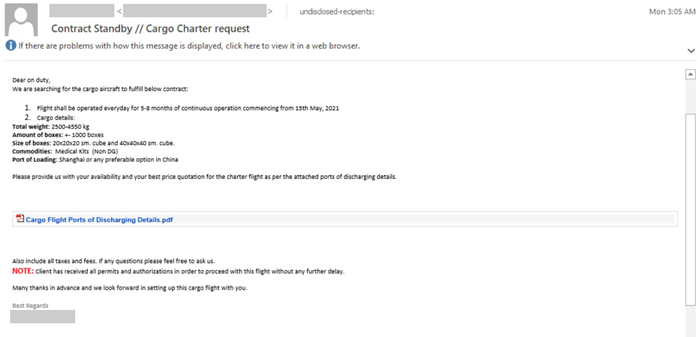공격자들은 항공우주 및 여행 업체를 대상으로 피싱 이메일을 보냈으며, 이메일에 첨부된 가짜 PDF 파일을 다운로드하도록 유도하여 악성코드를 유포하였다.
