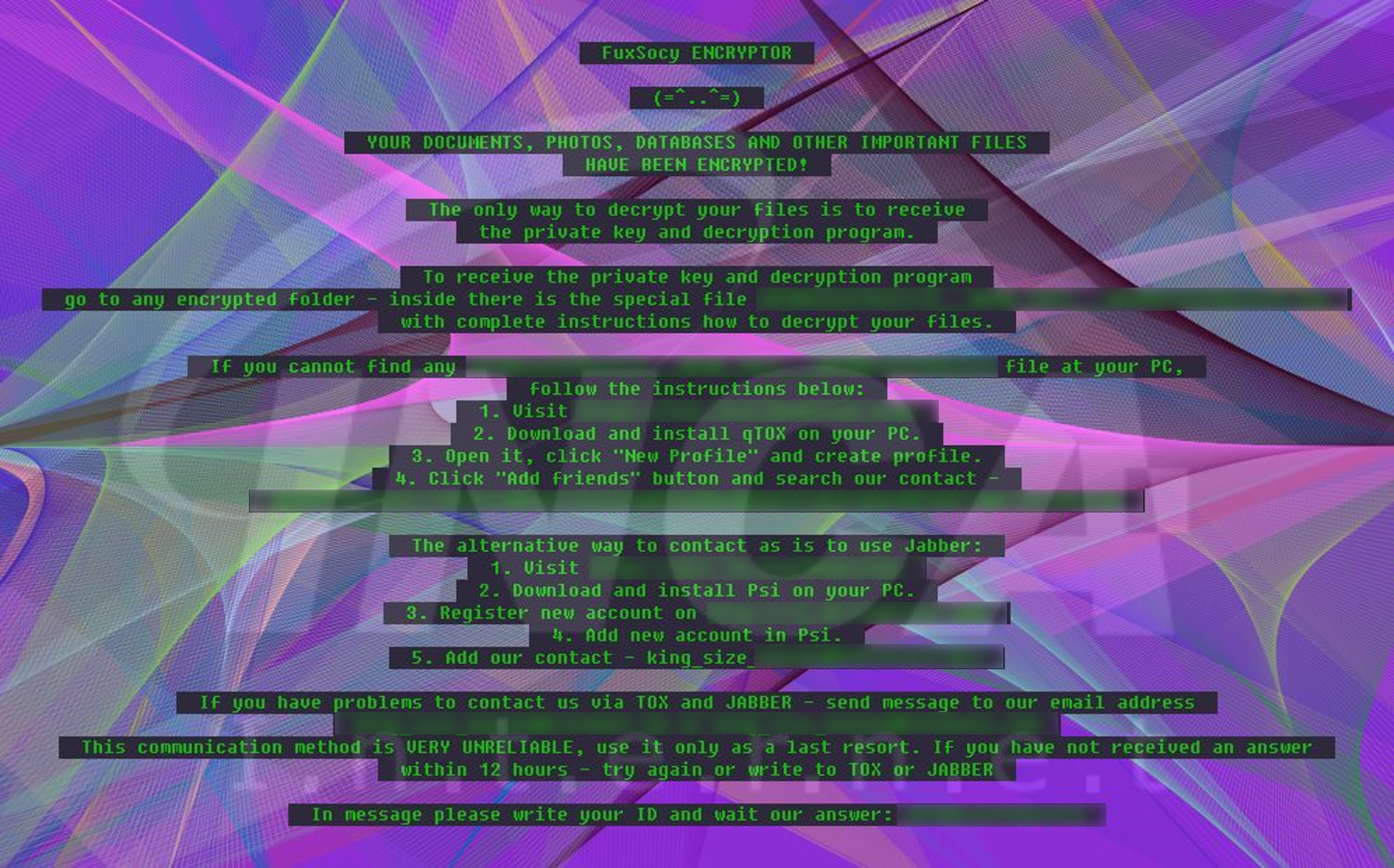 파일명에 [랜덤 문자열].fse_[ID] 확장자를 추가하고 [ID]__READ_THIS__[ID].jpg"라는 랜섬노트를 생성하는 "FuxSocy" 랜섬웨어의 변종이 발견됐다.