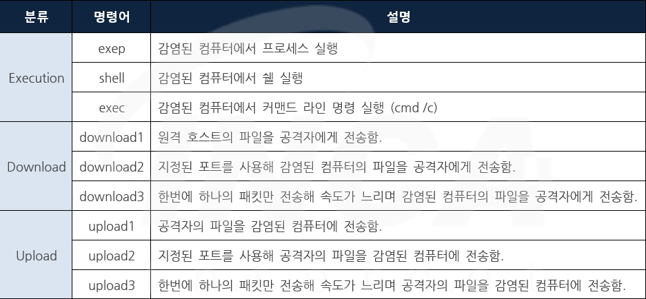 해당 악성코드가 실행하는 명령은 [표 1]과 같으며 download와 upload 명령어는 각각 3개씩 사용한다.
