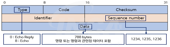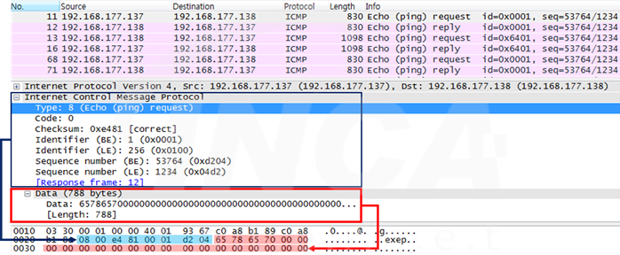 해당 악성코드는 탐지를 우회할 목적으로 ICMP 패킷에 임의의 데이터를 추가한 후, 에코 요청과 응답을 사용해 공격자와 통신하는 ICMP 터널링(Tunneling)이란 기법을 사용한다. 또한, 식별을 위해 1234~1236의 시퀀스 번호를 설정했으며, 일반적인 명령을 보낼 때는 시퀀스 번호를 1234로 지정한다. 마지막으로 ICMP의 Data 필드는 788 Bytes의 크기로 악성코드가 실행할 명령 또는 명령과 관련된 데이터를 포함한다.