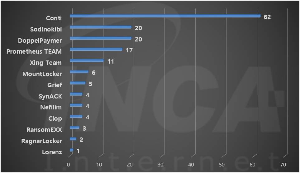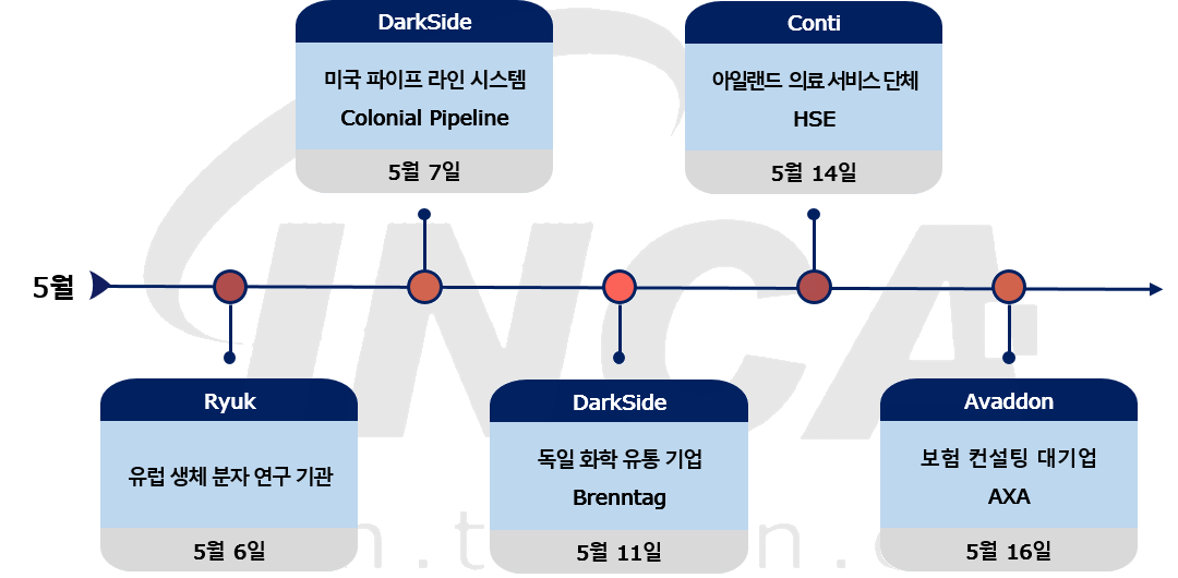 2021년 5월(5월 1일 ~ 5월 31일) 한 달간 랜섬웨어 동향을 조사한 결과, "DarkSide" 랜섬웨어가 미국 파이프 라인 시스템인 Colonial Pipeline과 독일의 화학 유통 기업 Brenntag를 공격했다. 또한, "Ryuk" 랜섬웨어가 유럽의 생체 분자 연구 기관을 공격했고, 아일랜드 의료 서비스 단체 HSE와 글로벌 보험 컨설팅 대기업 AXA가 각각 "Conti" 랜섬웨어와 "Avaddon" 랜섬웨어 공격을 받아 데이터가 유출된 사건이 있었다.