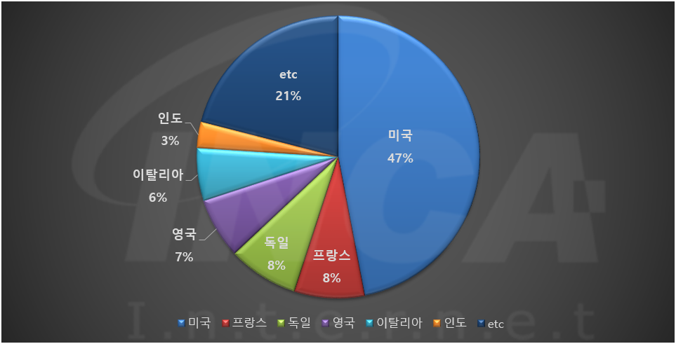 2021년 5월(5월 1일 ~ 5월 31일)에 발생한 데이터 유출 건을 국가별로 비교하였을 때 미국이 47%로 가장 높은 비중을 차지했고, 프랑스와 독일이 각각 8%, 영국과 이탈리아가 각각 7%와 6%로 그 뒤를 따랐다.