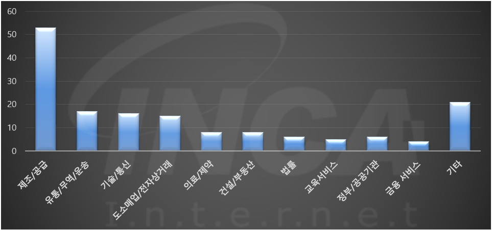 2021년 5월(5월 1일 ~ 5월 30일)에 발생한 데이터 유출 건을 산업별로 비교하였을 때 제조/공급 분야가 가장 많은 공격을 받았고, 유통/무역/운송 분야 및 기술/통신 분야가 그 뒤를 따랐다.