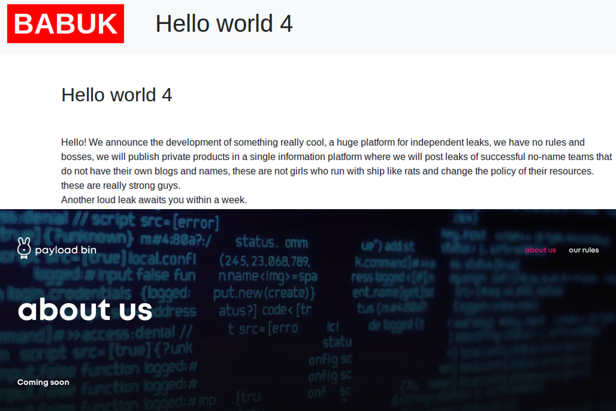 BabukLocker 랜섬웨어의 데이터 유출 사이트 종료 이전에 게시된 "Hello World 4"라는 제목의 게시글에서는 암호화 중단과 함께 데이터 유출 만을 위한 거대한 플랫폼을 개발하고 있다는 내용을 담고 있었다.