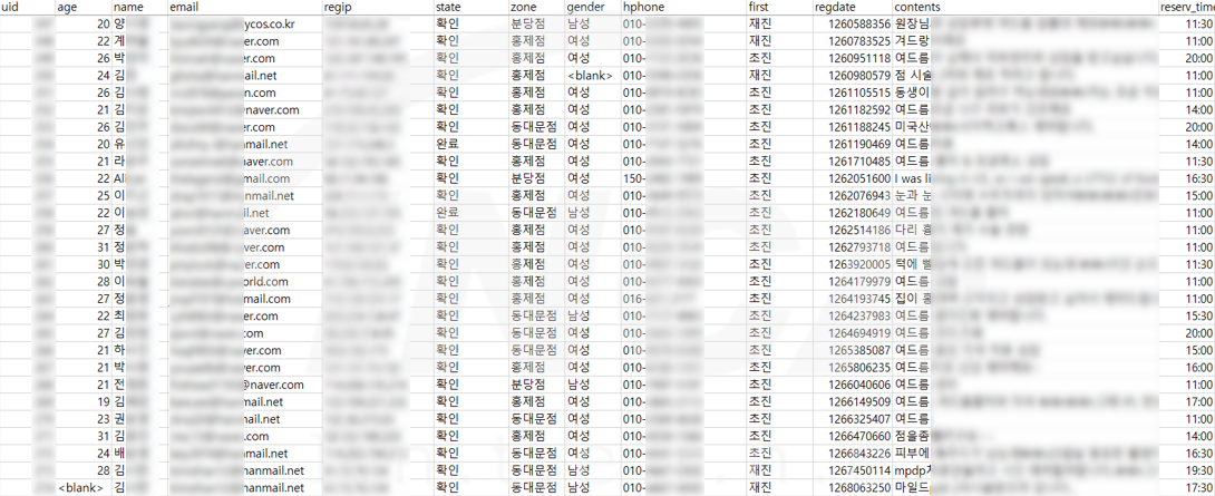 이 중 [그림 3]과 같이 상담 및 예약 내용, 아이디, 전화 번호, 이메일 주소 등의 개인 정보가 담겨있는 파일도 확인되고 있다.