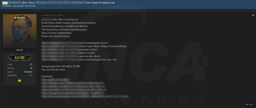 한 해커가 국내 피부과로부터 탈취했다고 주장하는 데이터를 지난 6월 5일 해커 포럼에 공개했다. 이 해커는 게시글을 통해 총 960MB의 데이터를 탈취했다고 주장 중이며, 탈취한 데이터 일부를 다운로드할 수 있는 링크를 공개했다.