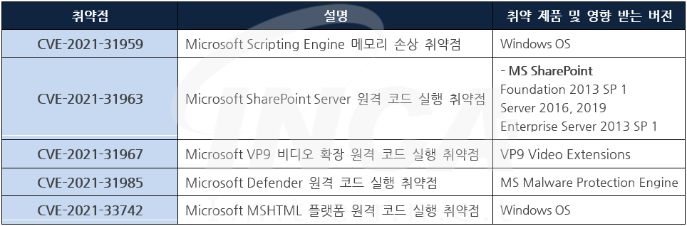 Microsoft 사는 제품에서 발생하는 취약점에 대한 보안 업데이트를 발표하고, 관련 취약점을 해결하기 위해 최신 버전으로 업데이트할 것을 권고하였다.