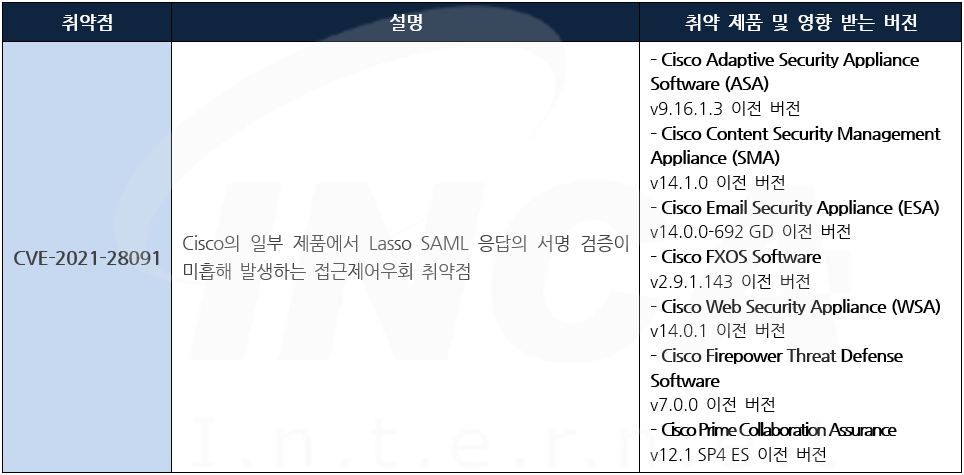 Cisco 사는 제품에서 발생하는 취약점에 대한 보안 업데이트를 발표하고, 관련 취약점을 해결하기 위해 최신 버전으로 업데이트할 것을 권고하였다.