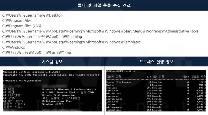 해당 악성코드는 [표 3]에 작성된 경로의 하위 폴더 및 파일 목록과 시스템 및 프로세스 실행 정보를 수집해서 공격자가 운영하는 C&C 서버로 전송한다.
