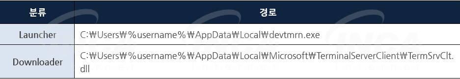 “SkinnyBoy” 악성코드를 실행하면 [표 1]과 같이 런처(Launcher)와 다운로더(Downloader) 특징을 지닌 파일을 드롭하고 자가삭제한다.