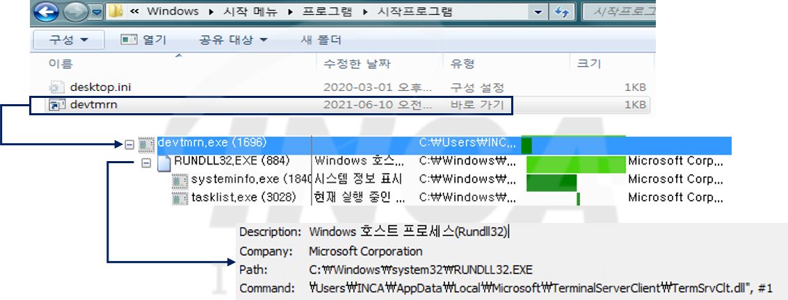 이후, 감염된 PC를 재부팅하면 이전 단계에서 생성한 링크 파일이 자동 실행돼 해당 파일에 지정된 경로의 파일을 실행한다. 그다음 [그림 2]와 같이 런처에서 DLL 파일을 실행해 정보 탈취 및 다운로드 단계를 진행한다.