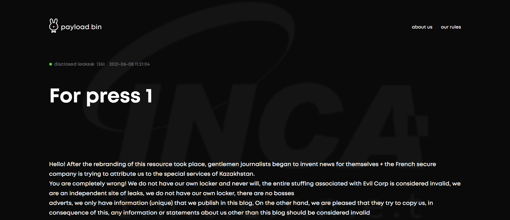 Evil Corp 사이버 공격 그룹의 후속 랜섬웨어로 지목됐던 PayloadBIN의 운영진이 자신들의 데이터 유출 사이트에 입장 발표글을 게시했다.