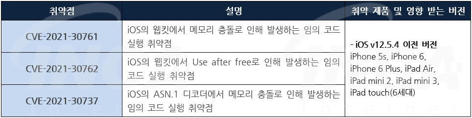 Apple 사는 제품에서 발생하는 취약점에 대한 보안 업데이트를 발표하고, 관련 취약점을 해결하기 위해 최신 버전으로 업데이트할 것을 권고하였다.