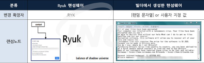 [표 1]은 빌더에서 생성한 랜섬웨어와 제작자가 주장하는 류크 랜섬웨어를 비교한 표이며, 파일 암호화 후 변경하는 확장자와 랜섬노트에서는 유사점이 발견되지 않았다.