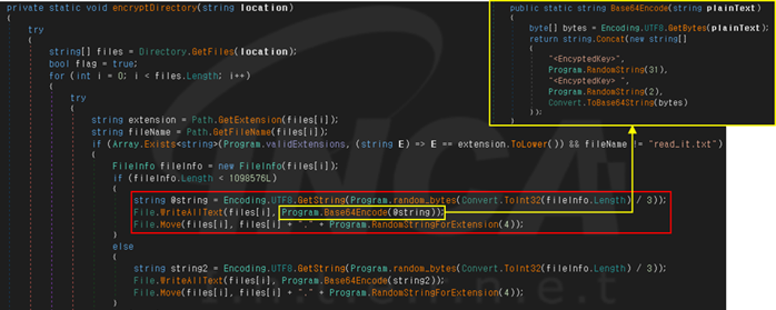 다음으로, 빌더에서 생성한 랜섬웨어는 류크 랜섬웨어에서 사용하는 AES나 RSA 암호화 알고리즘이 아닌 Base64 인코딩을 사용한다. 이 과정에서 파일을 유니코드로 읽어와 일부만 인코딩하므로 파일이 손상돼 복구가 어렵다.
