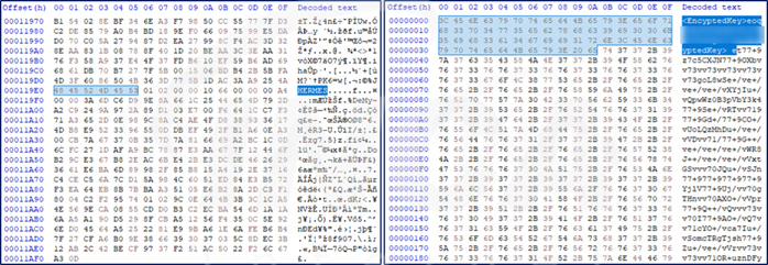 또한, 해당 랜섬웨어는 [그림 4]의 오른쪽과 같이 파일을 암호화 한다. 이에 반해 류크 랜섬웨어는 [그림 4]의 왼쪽과 같이 "HERMES"라는 키워드를 사용하므로 두 파일의 암호화에 대한 유사점이 발견되지 않았다.