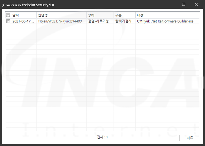 상기 악성코드는 잉카인터넷 안티바이러스 제품 TACHYON Internet Security 5.0에서 진단 및 치료가 가능하다.