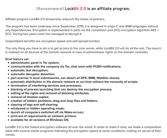 최근 발표한 Lockbit 2.0은 20분 이내 100GB의 데이터를 유출할 수 있다고 주장하며 가장 빠른 암호화 및 데이터 유출 제공을 약속한다.