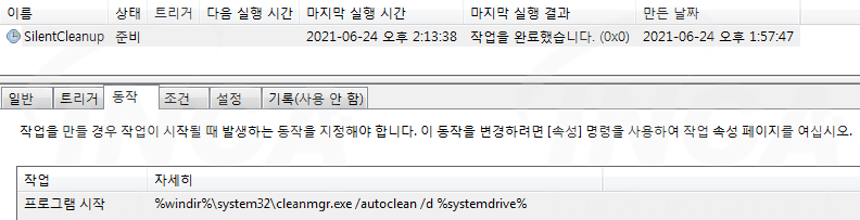 또한, 기본적으로 사용자 PC에는 디스크 정리를 위해 작업 스케줄러에 "SilentCleanup"가 등록되어 있어서 관리자 권한이 있는 "cleanmgr.exe"를 호출한다. "SilentCleanup" 작업은 [그림 7]과 같이 '동작' 탭에 등록된 호출 경로에 "WINDOWS" 경로를 "%windir%"과 같이 환경 변수를 참고한 경로가 적용된다.