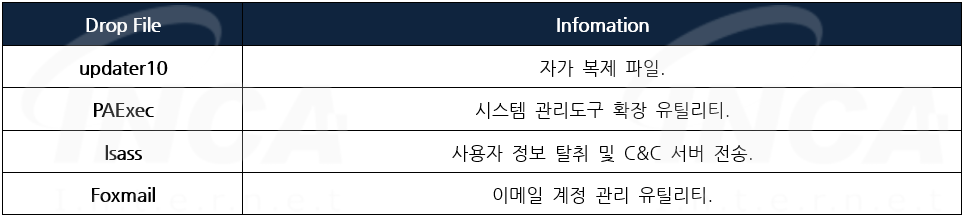 "PAExec", "lsass(악성)", "Foxmail" 파일은 "Klingon RAT" 파일 내부에 'GZIP' 확장자 형태로 저장되어 있으며 "archive/zip" 함수를 사용하여 파일의 압축을 해제한 후 "%TEMP%" 경로에 드랍한다.