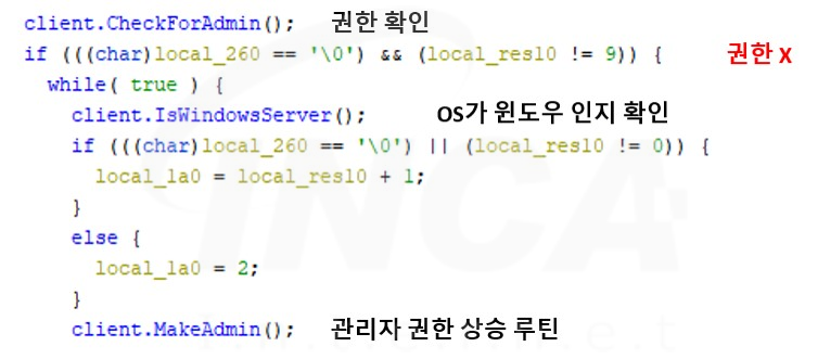 실행된 "Klingon RAT"는 관리자 권한이 있어야 접근할 수 있는 "PHYSICALDRVIE0"와 "SCSI0"에 접근을 시도하여 프로세스가 관리자 권한이 있는지 확인한다. 만약 관리자 권한이 없는 것으로 확인이 되면 사용자의 OS가 윈도우 환경인지 확인후 권한 상승을 위한 루틴을 실행한다.