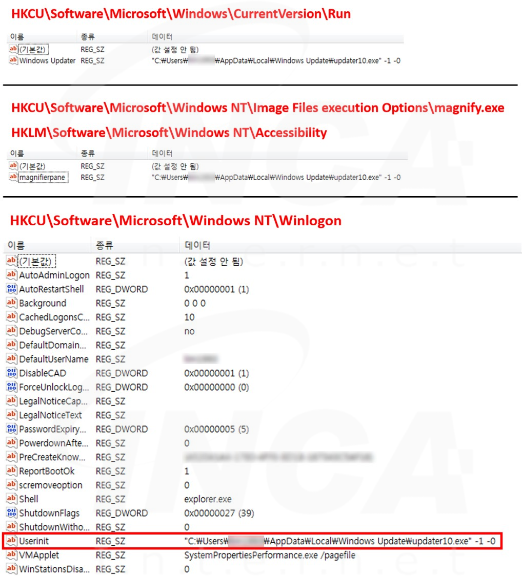 자동 실행 레지스트리에 자가 복제 파일을 등록하고, 윈도우 시작 시 항상 실행되는 화면 확대 프로그램인 "magnify.exe" 레지스트리를 변조하여 "magnify.exe"와 "Klingon RAT"가 함께 실행되도록 한다. 또한, 윈도우가 부팅될 때 자동으로 실행되는 winlogon의 레지스트리를 변조하여 동시에 악성코드가 실행될 수 있도록 한다.